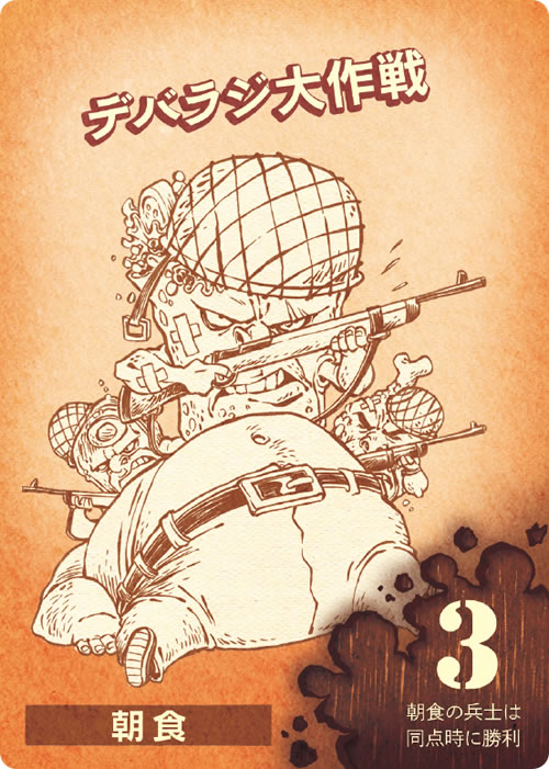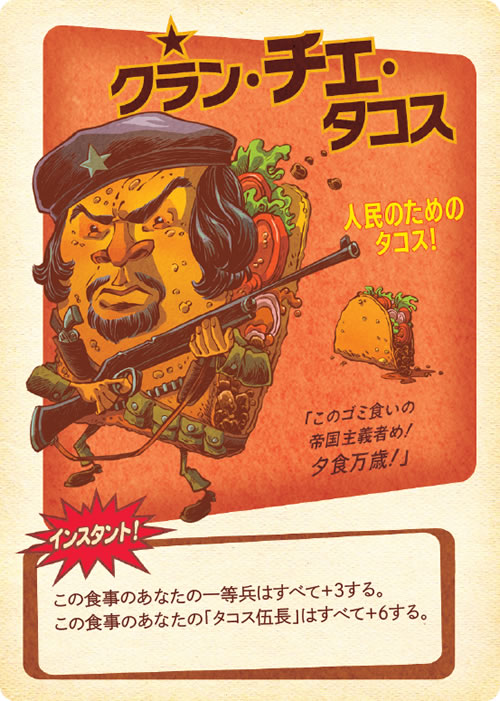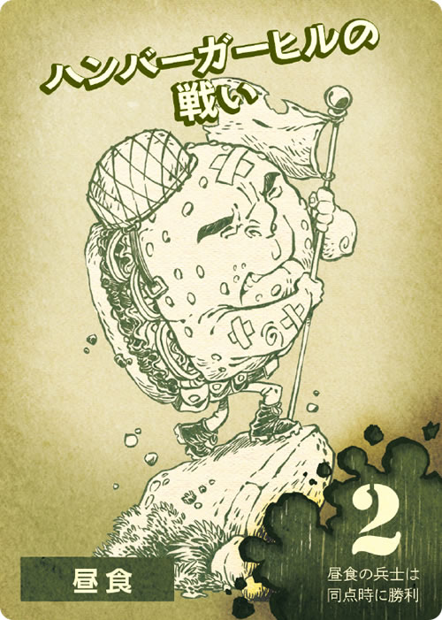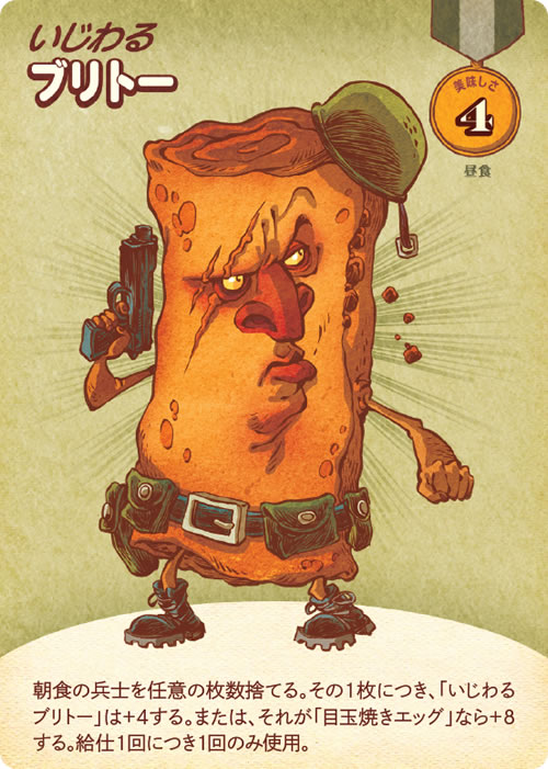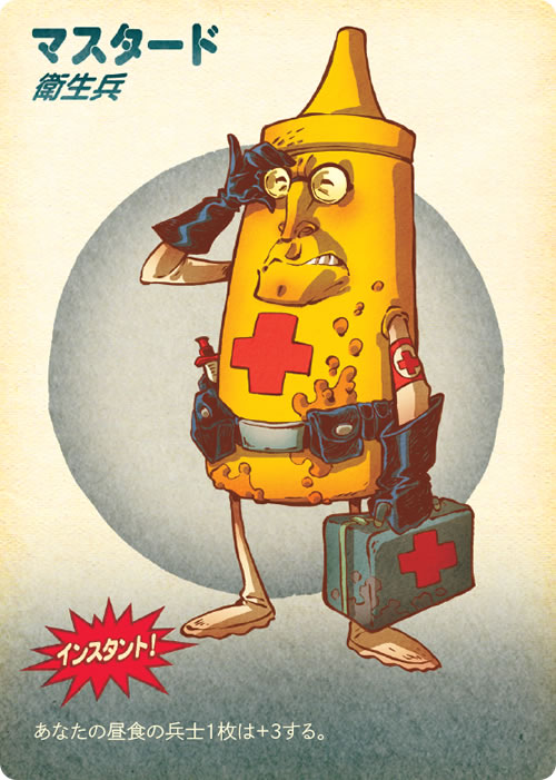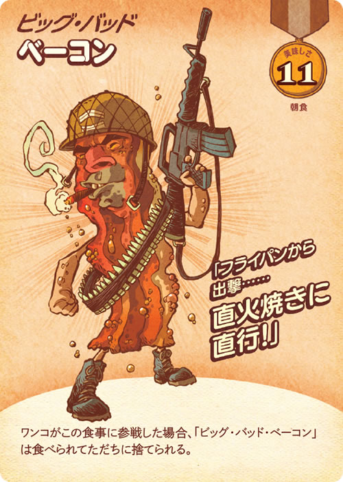 この食事は2-6人前だ。「ウィンナー少佐」や「チーズバーガー将軍」といったフード兵士をドラフトし、朝食や昼食や夕食での勝利を目指せ。「ハンバーガーヒルの戦い」での栄光へいざ進め! ひと味足りないと思ったら、「マスタード衛生兵」といったインスタントをトッピングだ。勝利するのは最も美味しさの高いフードだ! 「トーストマスター将軍」などのマスコットがいれば優位に立てるが、ワンコにはくれぐれも注意すること。完璧な一皿を犬の餌にするわけにはいかないのだ。
